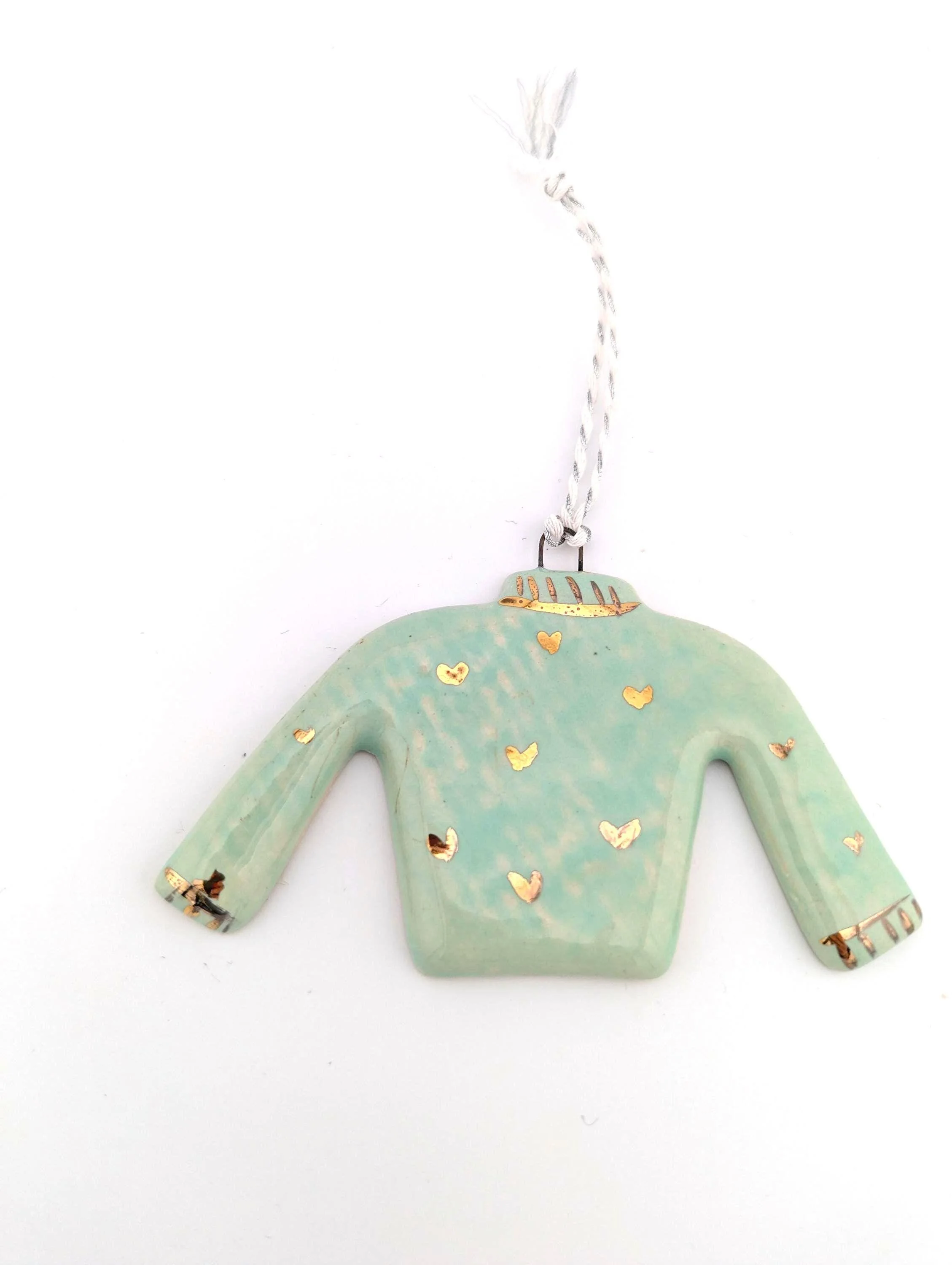 Ceramic handmade sweater ornament with gold hearts