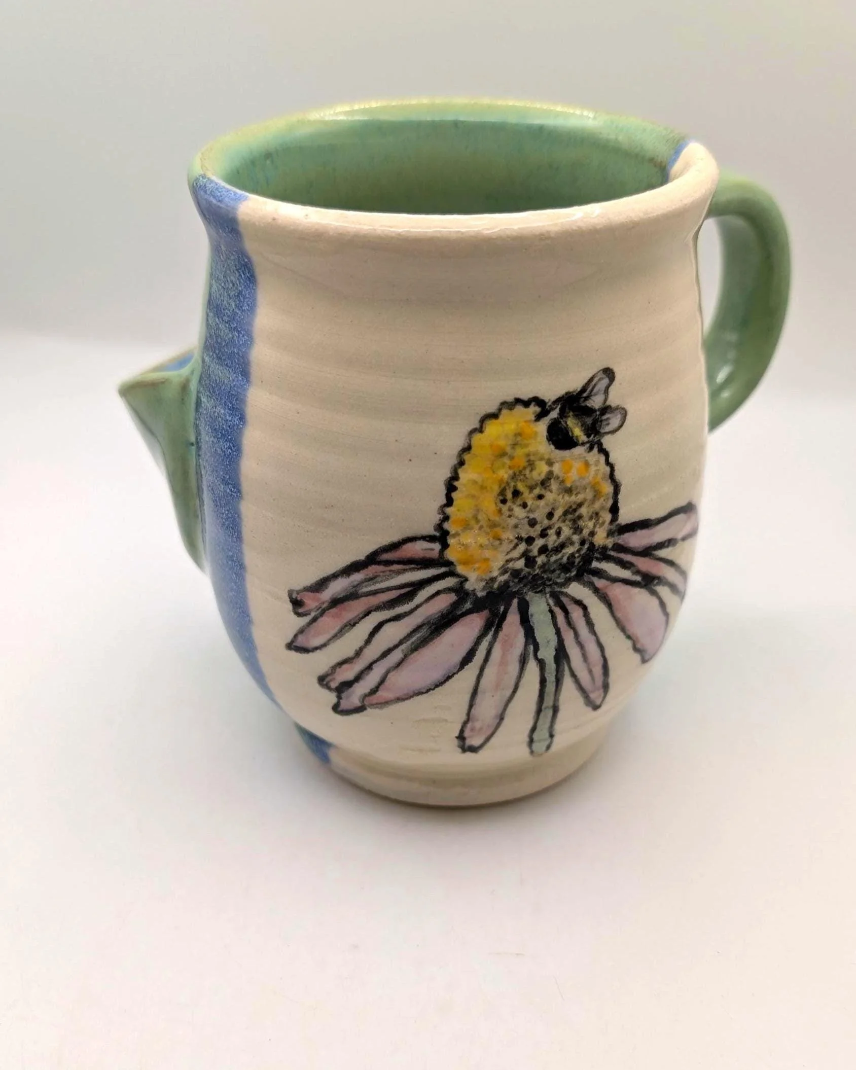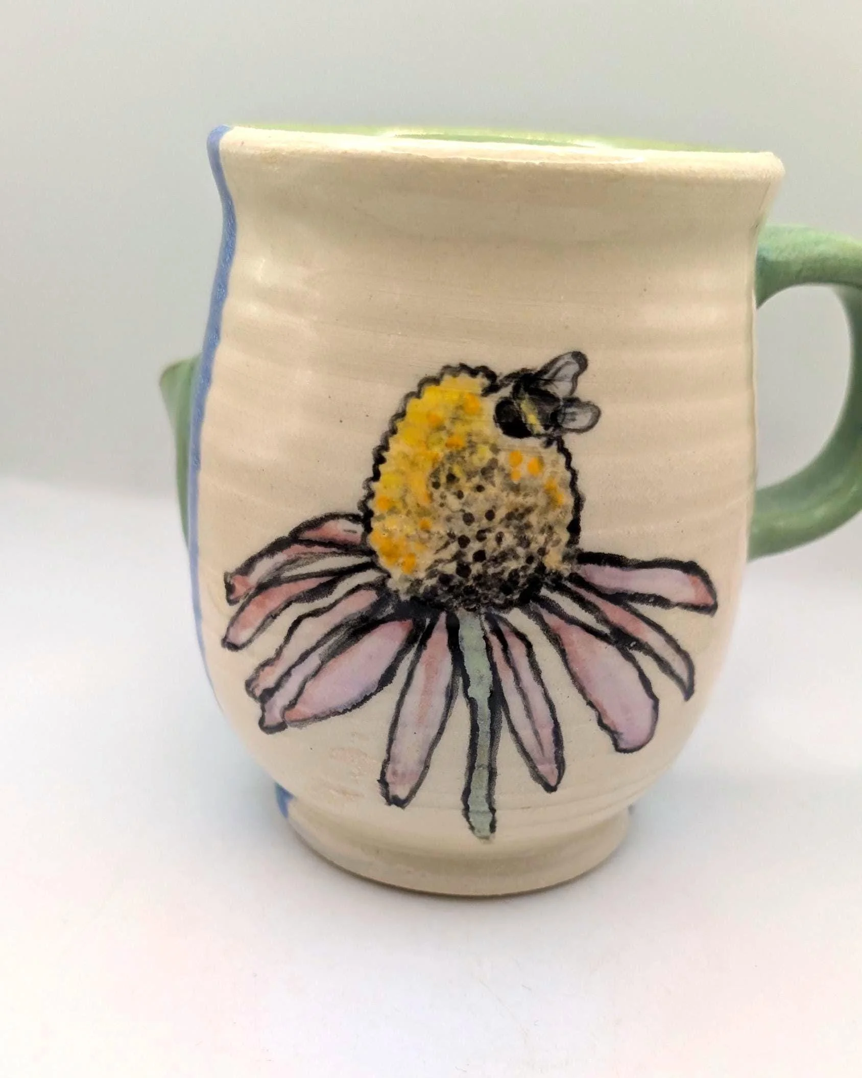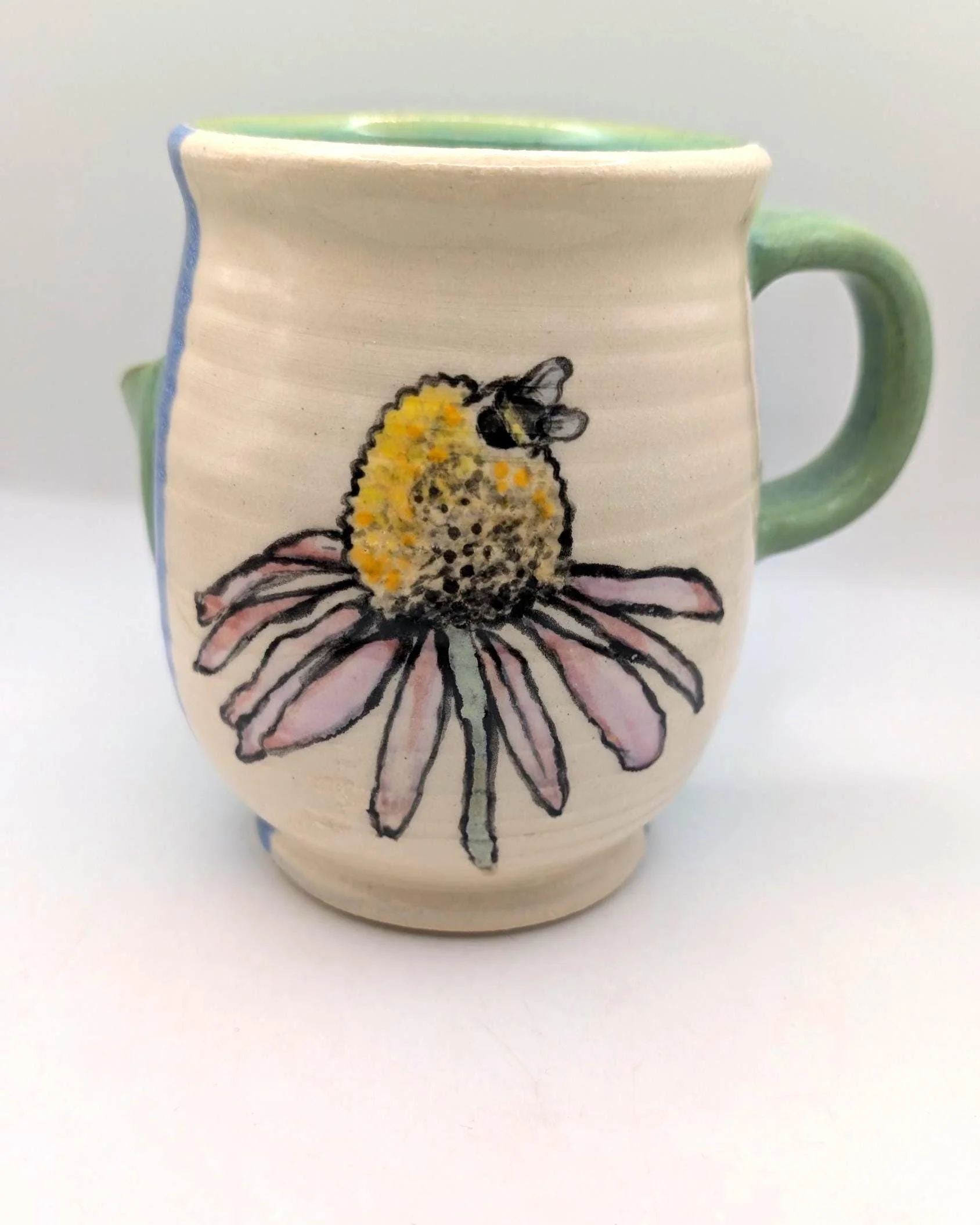 Each 14 oz piece is uniquely shaped by hand and decorated with an original, hand-painted honeybee on an echinacea flower. The interior is finished in a soft celadon green, contrasting with the textured white exterior and cobalt blue accents.