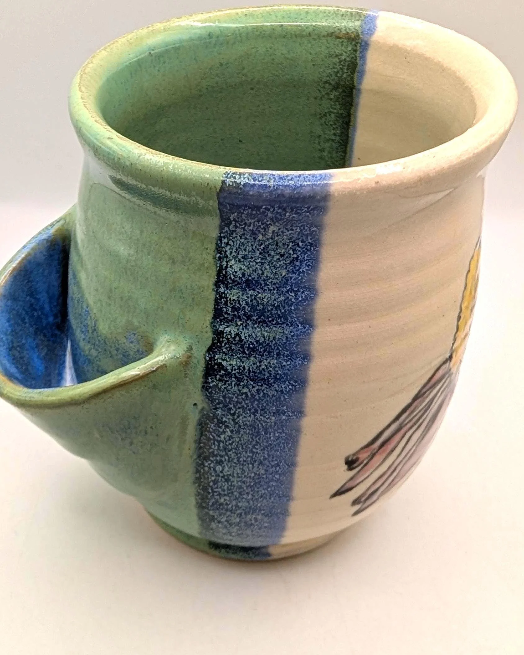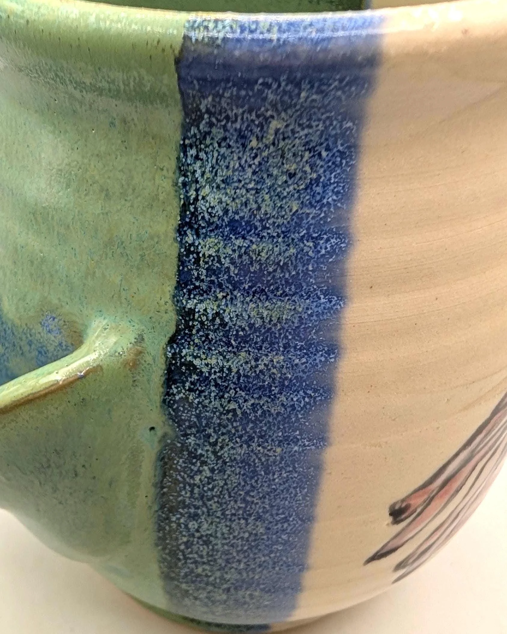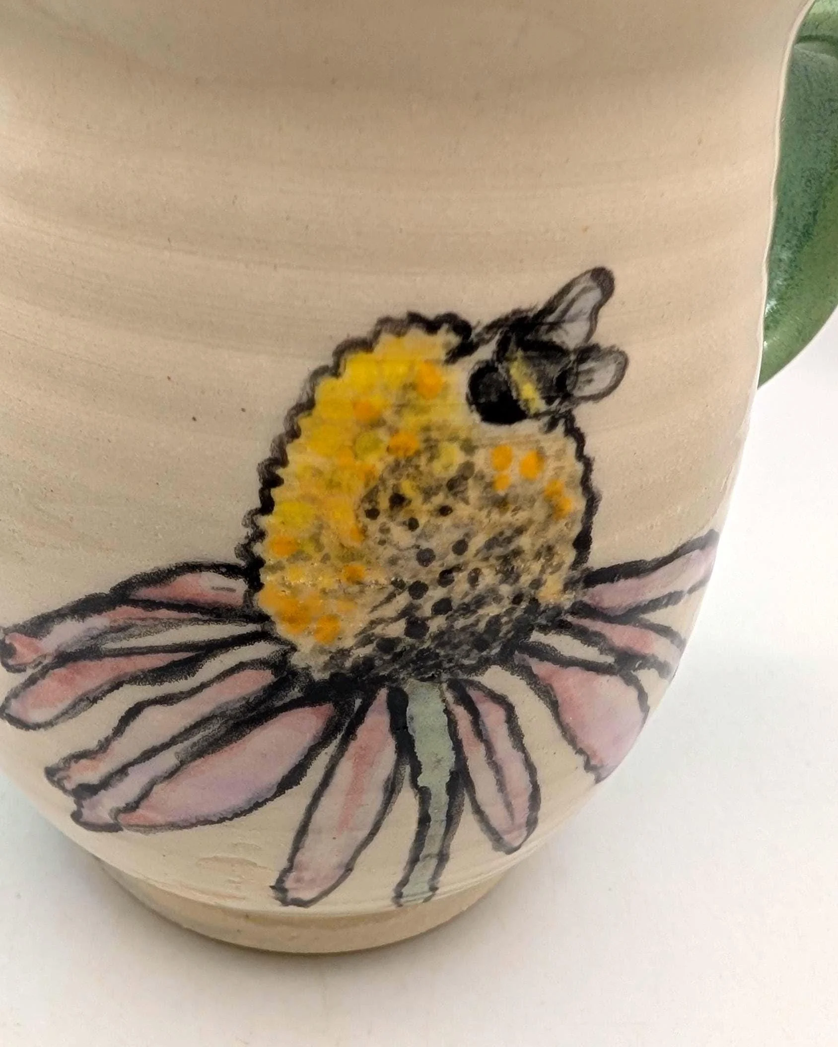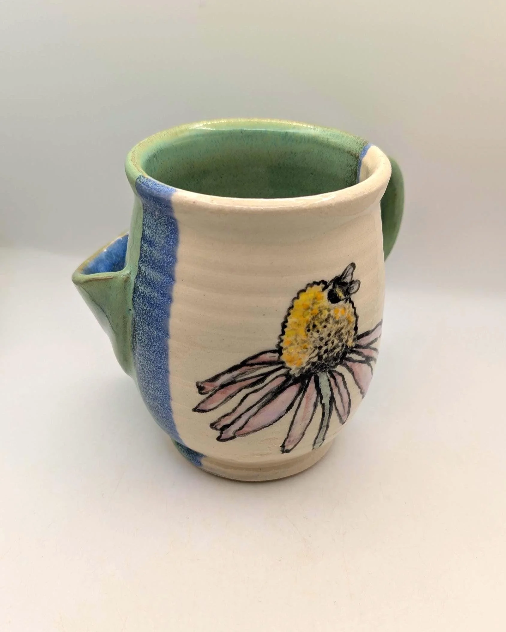 Each 14 oz piece is uniquely shaped by hand and decorated with an original, hand-painted honeybee on an echinacea flower. The interior is finished in a soft celadon green, contrasting with the textured white exterior and cobalt blue accents.